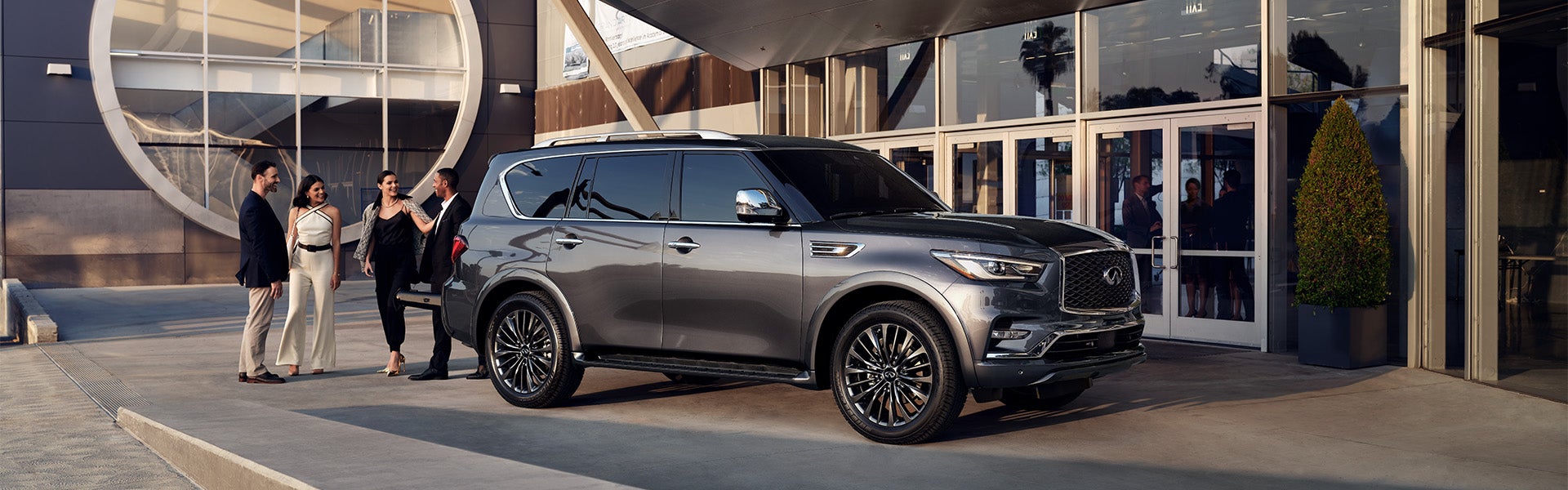 You can get the 2023 INFINITI QX80 in six levels: Luxe, Luxe 4WD, Premium Select, Premium Select 4WD, Sensory, and Sensory 4WD. The Luxe comes with 20-inch aluminum alloy wheels, automatic on/off LED headlights, a power-sliding tinted glass moonroof, and a power rear liftgate. On the Premium Select, you get 22-inch dark chrome wheels. The bold Sensory adds an adaptive front lighting system with auto-leveling headlights.